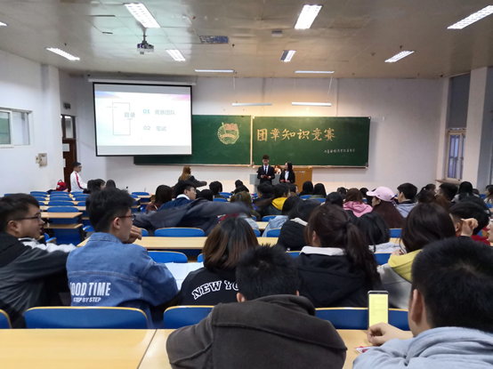 比赛在全体团员齐唱《光荣啊,中国共青团》的嘹亮歌声中拉开序幕。本次比赛分为团队竞赛和笔试两部分。团队竞赛由每个团支部推选7人为一组,随机抽选3人上台答题,答题过程中,各组选手表现优异,竞争十分激烈,不时获得场下观众阵阵掌声。笔试环节,同学们有备而来,非常认真的完成了全部试题。