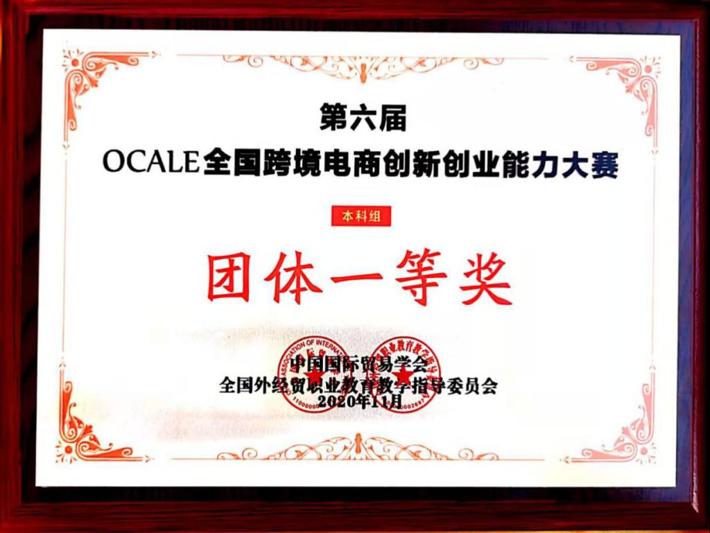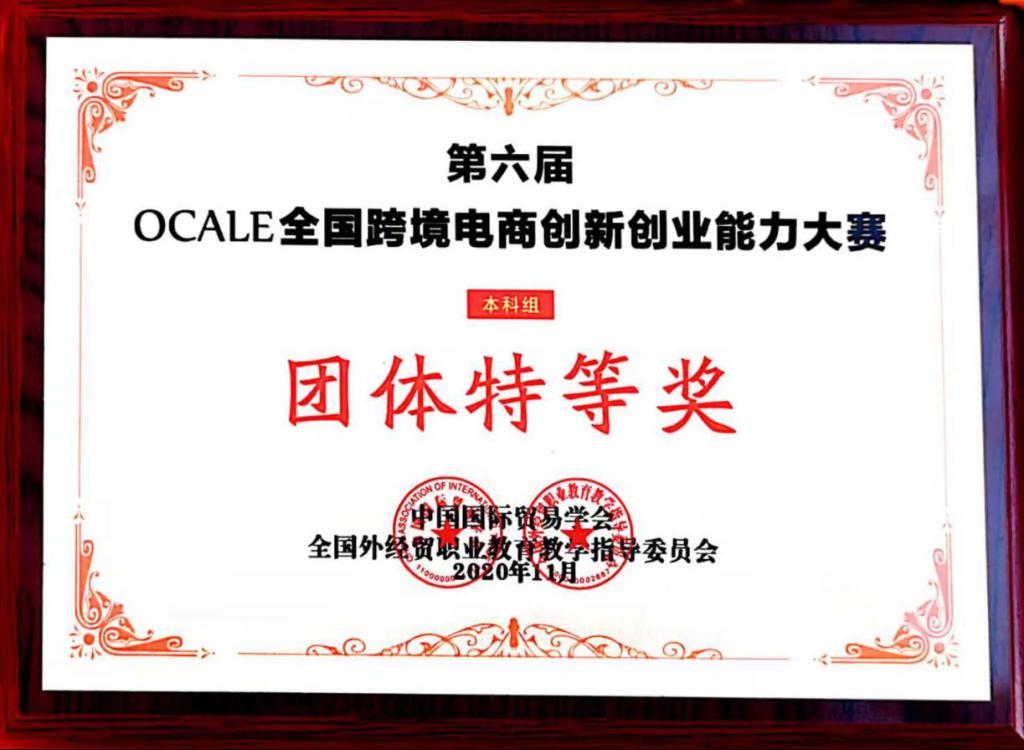 11月4日由全国外经贸职业教育教学指导委员会和中国国际贸易学会共同举办的第六届OCALE全国跨境电商创新创业能力大赛圆满落幕。beat365官网beat365中文官方网站国际经济与贸易专业学生组成六支代表队,在籍丹宁和刘黎明老师的指导下,从全国108所本科高校342支队伍中脱颖而出,最终由陈虹、沈茂菊、韩冬冬、欧冰冰、宋欣、张文佳、张世泽、王春月、叔馨悦、赵开旗、辛璞、沈松松等学生组成的四支队伍获得团体特等奖;杨顺、王烨菲、周红宇、白梦蝶、金国栋、苏媛等学生组成的两支队伍获得团体一等奖。