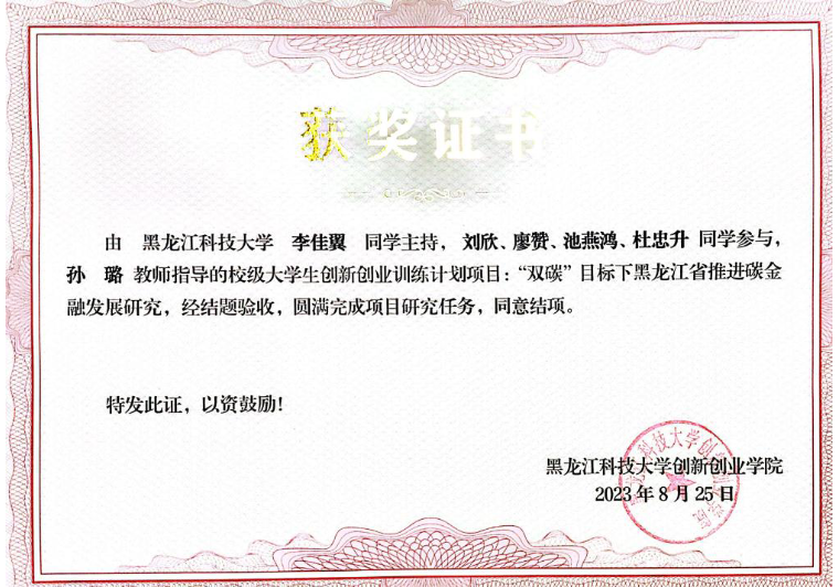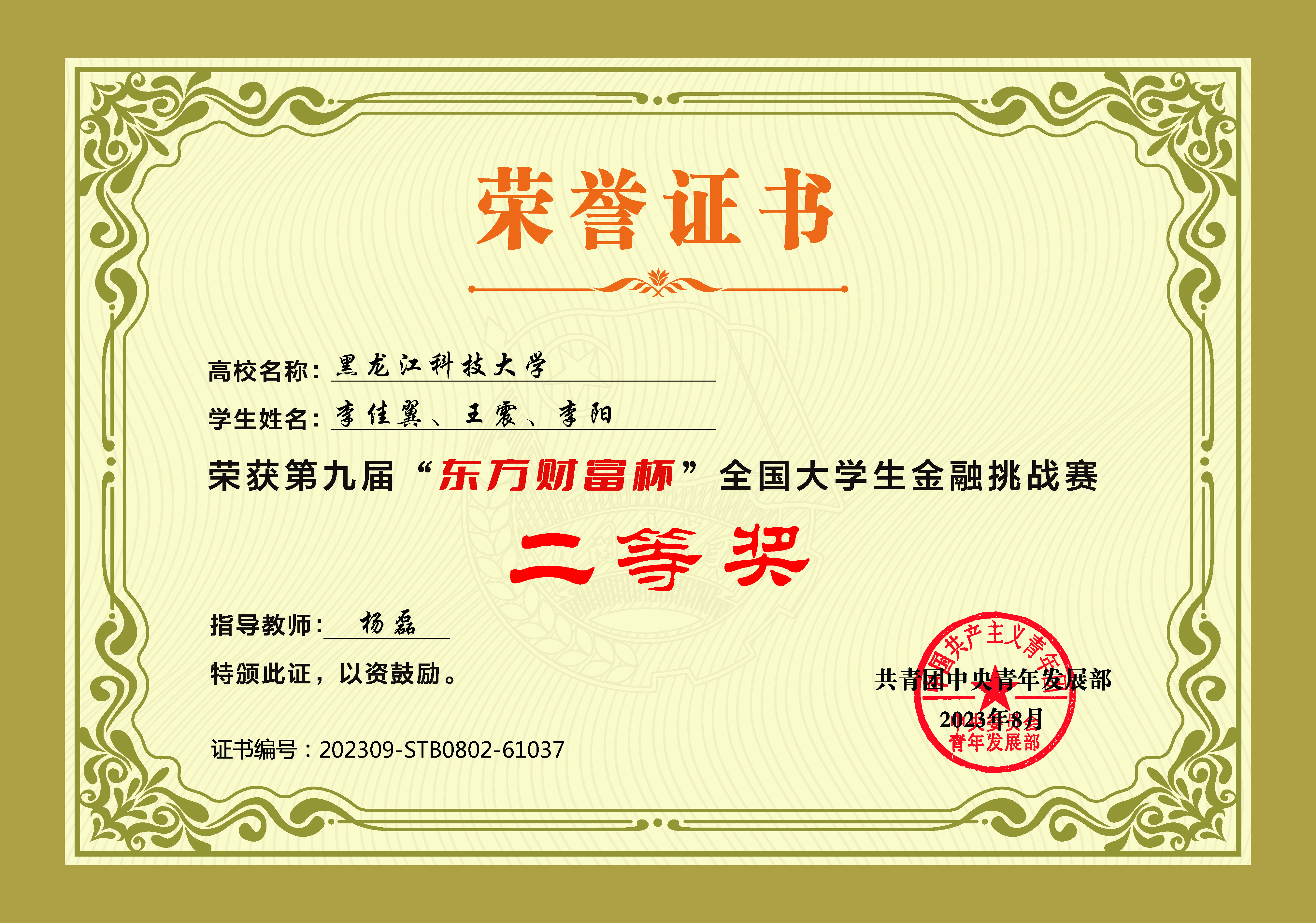 李佳翼,女,中共党员,班级团支部书记兼学习班长,曾任beat365中文官方网站大学生军乐团部长、beat365中文官方网站大学生科技协会活策部部长、beat365中文官方网站学生会学习部部长、beat365中文官方网站金融协会会长,因成绩优异保送云南大学攻读硕士研究生。在校期间,曾被授予省“三好学生”、校“三好学生”、“优秀共青团员”、“学风建设先进个人”、“优秀学生会工作人员”等荣誉称号。多次代表学校、黑龙江省参加创新创业能力大赛,曾获得国家励志奖学金荣誉、“全国高校商业精英挑战赛全国一等奖”、“第十三届全国大学生电子商务三创挑战赛国家二等奖”、“第九届东方财富杯省级三等奖”、“第九届‘互联网+’大学生创新创业竞赛省级铜奖”、“黑龙江省大学生创新创业训练计划省部级项目”等,共计国家级奖项4项、省级奖项7项、校级奖项十余项。