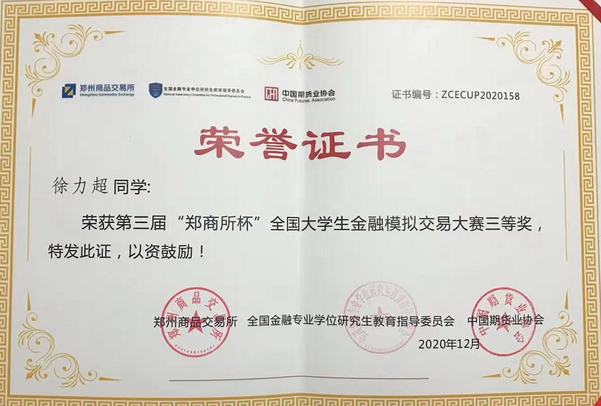 陈章杰,男,中共党员,班级团支部书记,beat365中文官方网站大学生科技协会主席,beat365中文官方网站金融协会会长,因成绩优异保送云南大学攻读硕士研究生。在校期间,曾被授予“优秀毕业生”、校“三好学生”、“优秀共青团干部”、“学风建设先进个人”等荣誉称号。多次代表学校、黑龙江省参加创新创业能力大赛,曾获得国家奖学金荣誉、“全国高校商业精英挑战赛全国一等奖”、“第七届OCALE全国跨境电商创新创业能力大赛国家一等奖”、“‘华数杯’全国大学生数学建模竞赛三等奖”、“第八届黑龙江省‘互联网+’大学生创新创业竞赛省级铜奖”、“黑龙江省大学生创新创业训练计划省部级项目”等,共计国家级奖项4项、省级奖项4项、校级奖项13项。