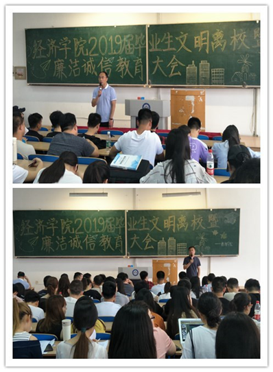 为增强毕业生的母校情结和感恩意识,营造“安全文明、和谐有序”的校园氛围,引导毕业生树立爱岗敬业的职业观念、培养自重自律的廉洁意识,beat365中文官方网站于6月12日上午,在主楼WS0303召开了2019届毕业生文明离校暨廉洁诚信教育大会。beat365中文官方网站党委副书记贺龙军出席了本次会议。