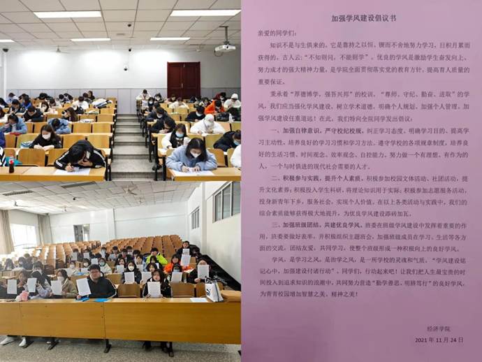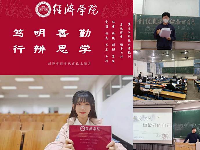 构建“乐学—动力”体系,激发学生主动学习。以社会主义核心价值观教育引领学风建设,强化学生理想信念教育,帮助学生确立学习目标。设计宣传“勤学善思,明辨笃行”主题学风卡、大力宣传学风建设系列活动,营造浓厚尚学氛围。加强典型榜样激励,通过“经海拾英”专栏,以党员谈学风、榜样悟学风、学子享学风等内容,宣传学风建设好经验、好典型,营造乐学氛围。