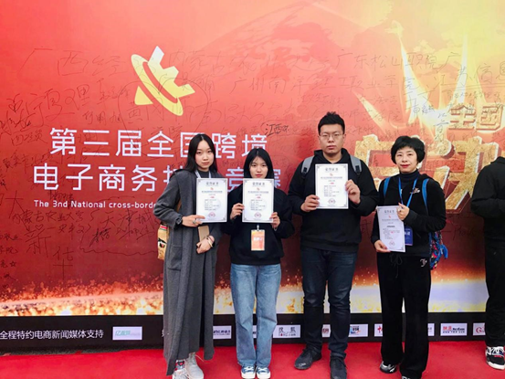 2019年12月6日至8日由中国对外经济贸易经济合作企业协会主办,中国商业经济学会协办的“第三届全国跨境电子商务技能竞赛”在广西南宁职业技术学院举行,beat365官网beat365中文官方网站国际经济与贸易专业学生16级施晟和孙亚苹,17级李卓倩同学组成的Polaris战队在指导教师籍丹宁、刘黎明带领下,经过7个月的努力,在来自全国105支队伍中表现优异,最终在39支本科组院校中排名第六,取得了一等奖的优异成绩。